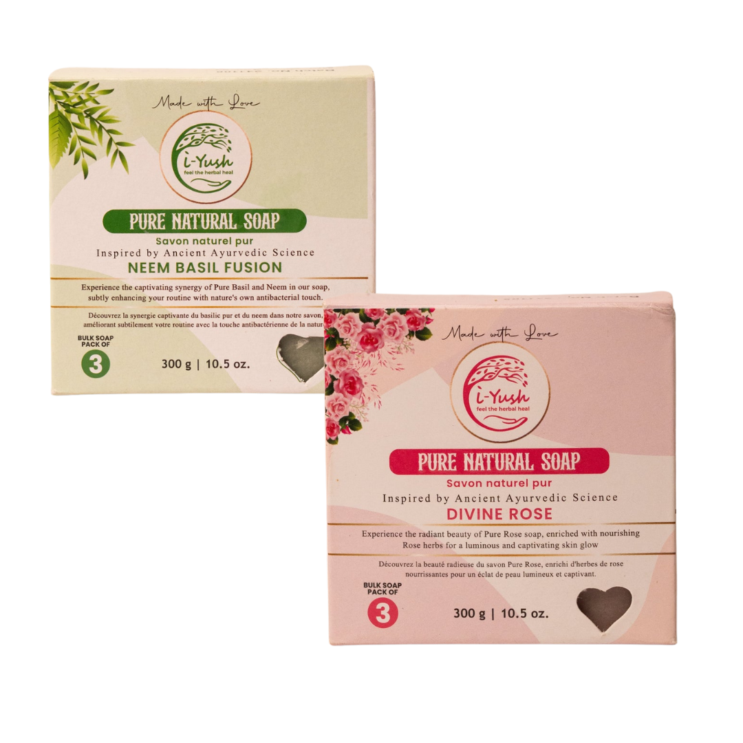 Six handcrafted bars: 3 Neem Basil + 3 Divine Rose. Purify with neem, soothe with roses. Because stressed skin needs both clarifying AND calming. Ancient Ayurvedic wisdom for sensitive, reactive skin.